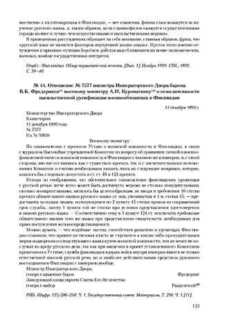 Отношение № 7577 министра Императорского Двора барона В.Б. Фредерикса военному министру А.Н. Куропаткину о нежелательности насильственной русификации военнообязанных в Финляндии. 11 декабря 1899 г.