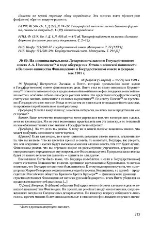 Из дневника начальника Департамента законов Государственного совета А.А. Половцева о ходе обсуждения Устава о воинской повинности в Великого княжества Финляндского в Государственном совете в феврале — мае 1901 г. 18 февраля (5 марта) — 16(29) мая 1901 г. // РГИА. Ф. 583. Оп. 1. Д. 54. Л. 1 об.-2, 88. Рукопись. Опубл.: Красный архив. 1923. № 3. С. 76-77, 92-93.