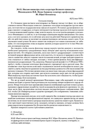 Письмо министра статс-секретаря Великого княжества Финляндского В.К. Плеве бывшему сенатору профессору Ю. Юрье-Коскинену. 8(21) мая 1901 г. // НАФ. Фонд личного происхождения сенатора Ю.С. Юрье-Коскинена, папка 19. Рукопись.