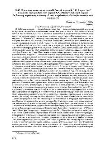 Докладная записка капеллана Эсбоской церкви К.Э.С. Генриксона и главного пастора Эсбоской церкви А.А. Флееге Эсбоской церкви Эсбоскому коронному ленсману об отказе публиковать Манифест о воинской повинности. 22 августа (4 сентября) 1901 г. // НАФ. Фонд Особый отдел Канцелярии генерал-губернатора, дело 104/IV/1901, папка Fb:43. Л. 62-64. Машинопись.