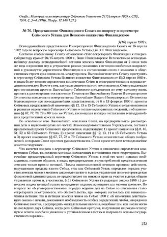 Представление Финляндского Сената по вопросу о пересмотре Сеймового Устава для Великого княжества Финляндского. 3(16) апреля 1902 г. // Опубл.: Материалы по пересмотру Сеймового Устава от 3(15) апреля 1869 г. СПб., 1904. С. 5-23. (РНБ. Шифр: 17.146.1.37.).