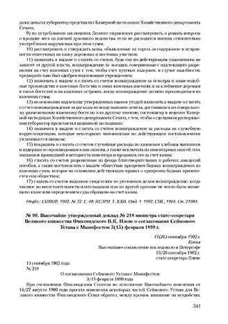 Высочайше утвержденный доклад № 218 министра статс-секретаря Великого княжества Финляндского В.К. Плеве о согласовании Сеймового Устава с Манифестом 3(15) февраля 1899 г. 13(26) сентября 1902 г. // ГА РФ. Ф. 499. Оп. 2. Д. 1. Л. 3-5. Типографский текст. РНБ. Шифр: 135/300-77. Государственный совет. Материалы. Т. 77 [1:XVII].