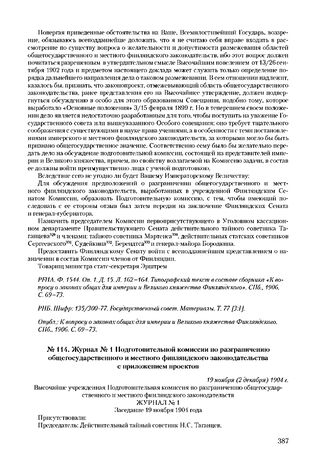 Журнал № 1 Подготовительной комиссии по разграничению общегосударственного и местного финляндского законодательства с приложением проектов. 19 ноября (2 декабря) 1904 г.