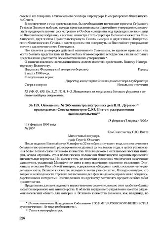 Отношение № 265 министра внутренних дел П.Н. Дурново председателю Совета министров С.Ю. Витте о разграничении законодательства. 18 февраля (3 марта) 1906 г. // РГИА. Ф. 1276. Оп. 18. Д. 3. Л. 1-4 об. Машинопись; Л. 13-14 об. Типографский текст.; Ф. 1544. Оп. 1. Д. 15. Л. 102-103 об. Типографский текст; Л. 171 -172 об. Типографский текст; Л. 180-181 об. Типографский текст.