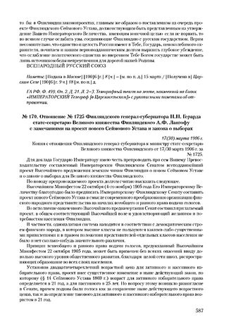 Отношение № 1725 Финляндского генерал-губернатора Н.Н. Герарда статс-секретарю Великого княжества Финляндского А.Ф. Лангофу с замечаниями на проект нового Сеймового Устава и закона о выборах. 17(30) марта 1906 г. // ГА РФ. Ф. 499. Оп. 2. Д. 17. Л. 3-7. Машинопись.