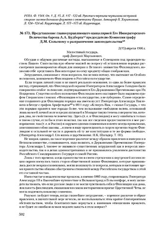 Представление Главноуправляющего канцелярией Его Императорского Величества барона А.А. Будберга председателю комиссии графу Д.М. Сольскому о разграничении законодательства. 2(15) апреля 1906 г. // РГИА. Ф. 1544. Оп. 1. Д. 15. Л. 186-192. Рукопись; Л. 193-195, 205-207. Типографский текст.