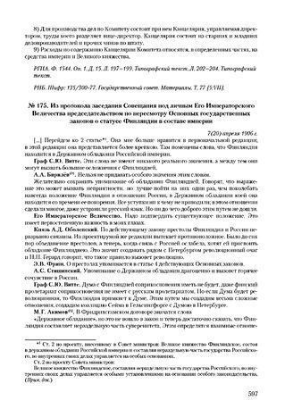 Из протокола заседания совещания под личным Его Императорского Величества председательством по пересмотру Основных государственных законов о статусе Финляндии в составе империи. 7(20) апреля 1906 г. // РГИА. Ф. 1544. Оп. 1. Д. 25. Л. 279 об. -282. Типографский текст. Опубл.: Протоколы заседаний Совещания подлинным его Императорского величества председательством по пересмотру основных государственных законов 7,9, 11 и 12 апреля 1906 года. СПб. [1906]. С. 7-23. (РНБ. Шифр: 17.147.1.27).