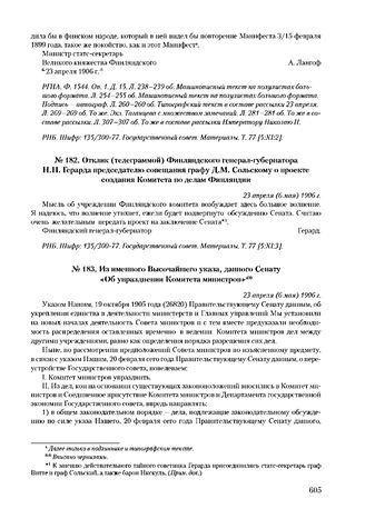 Отклик (телеграммой) Финляндского генерал-губернатора Н.Н. Герарда председателю совещания графу Д.М. Сольскому о проекте создания Комитета по делам Финляндии. 23 апреля (6 мая) 1906 г. // РНБ. Шифр: 135/300-77. Государственный совет. Материалы. Т. 77 [5:ХI:3].