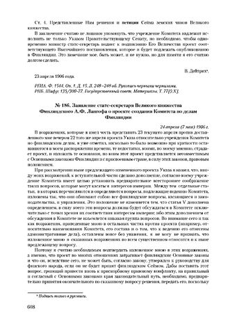 Заявление статс-секретаря Великого княжества Финляндского А.Ф. Лангофа о проекте создания Комитета по делам Финляндии. 24 апреля (7 мая) 1906 г.