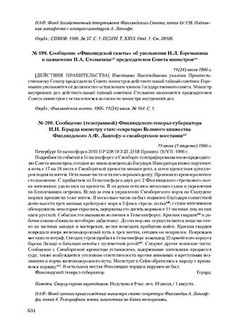 Сообщение (телеграммой) Финляндского генерал-губернатора Н.Н. Герарда министру статс-секретарю Великого княжества Финляндского А.Ф. Лангофу о свеаборгском восстании. 19 июля (1 августа) 1906 г.