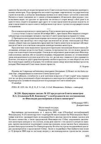 Циркулярное письмо № 137 председателя Совета министров П.А. Столыпина В.Н. Коковцеву о необходимости все постановления по Финляндии рассматривать в Совете министров. 5(18) января 1907 г.