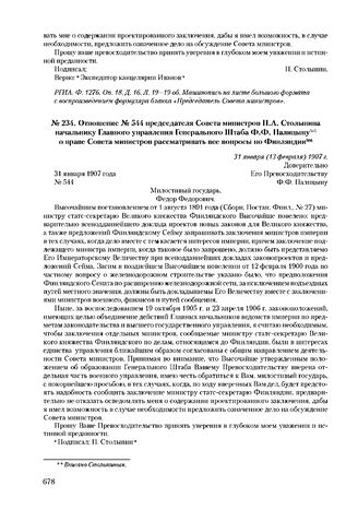 Отношение № 544 председателя Совета министров П.А. Столыпина начальнику Главного управления Генерального Штаба Ф.Ф. Палицыну о праве Совета министров рассматривать все вопросы но Финляндии. 31 января (13 февраля) 1907 г.
