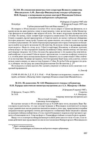 Из отношения министра статс-секретаря Великого княжества Финляндского А.Ф. Лангофа Финляндскому генерал-губернатору Н.Н. Герарду о вотировании военных платежей Финляндии Сеймом и назначении выборгского губернатора. 18 февраля (3 марта) 1907 г. // ГА РФ. Ф. 499. Оп. 2. Д. 15. Л. 9, 10 об. -11 об. Рукопись.