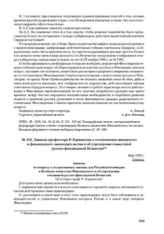 Записка профессора Р. Германсона о соотношении имперского и финляндского законодательства и об учреждении совместной русско-финляндской комиссии. Май 1907 г.