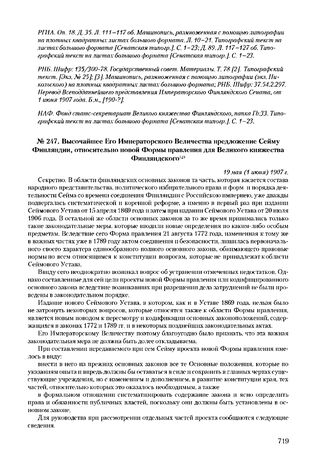 Высочайшее Его Императорского Величества предложение Сейму Финляндии, относительно новой Формы правления для Великого княжества Финляндского. 19 мая (1 июня) 1907 г. // РНБ. Шифр: 135/300-78. Государственный совет. Материалы. Т. 78 [4]. [Экз. № 58]. С. 1-14. [Типогр. Гoс. совета]. НАФ. Фонд статс-секретариат Великого княжества Финляндского, папка Fb:33. Типографский текст.