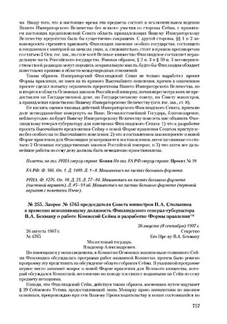 Запрос № 4765 председателя Совета министров П.А. Столыпина к временно исполняющему должность Финляндского генерал-губернатора В.А. Бекману о работе комиссий Сейма и разработке Формы правления. 26 августа (8 сентября) 1907 г. // PГИA. Ф. 1276. Оп. 18. Д. 35. Л. 93-93 об. Машинопись.