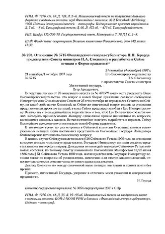 Отношение № 5715 Финляндского генерал-губернатора Н.Н. Герарда председателю Совета министров П.А. Столыпину о разработке в Сейме петиции о Форме правления. 21 сентября (4 октября) 1907 г.