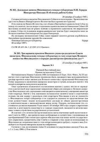 Три варианта проектов Именного указа председателю Совета министров, Финляндскому генерал-губернатору и статс-секретарю Великого княжества Финляндского о порядке рассмотрения финляндских дел. 23 октября (5 ноября) 1907 г. // РГИА. Ф. 1276. Оп. 18. Д. 54. Л. 43-47 об. Машинопись.