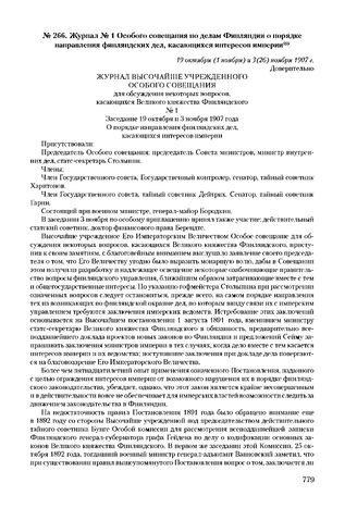 Журнал № 1 Особого совещания по делам Финляндии о порядке направления финляндских дел, касающихся интересов империи. 19 октября (1 ноября) и 3(26) ноября 1907 г.