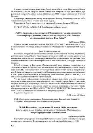 Высочайше утвержденное 11 января 1908 г. положение Совета министров о порядке назначения и увольнения Финляндского генерал-губернатора и его помощника. 11 (24) января 1908 г. // Опубл.: СУ. Ст. 119; ПСЗРИ. Т. XXVIII. 1908. Отд. 1. СПб., 1911. Ст. 29953; Сборник новейших узаконений и высочайших повелений, касающихся Финляндии. 1907-1912 гг. (Издание канцелярии Совета министров). СПб., 1912. С. 34.