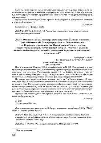 Отношение № 253 министра статс-секретаря Великого княжества Финляндского А.Ф. Лангофа председателю Совета министров П.А. Столыпину о представлении Финляндского Сената о порядке рассмотрения вопросов, затрагивающих интересы империи и Великого княже...