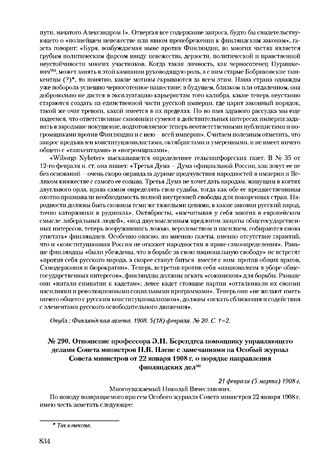 Отношение профессора Э.Н. Берендтса помощнику управляющего делами Совета министров Н.В. Плеве с замечаниями на Особый журнал Совета министров от 22 января 1908 г. о порядке направления финляндских дел. 21 февраля (5 марта) 1908 г.