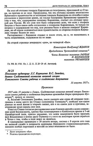 Показание ординарца Л.Г. Корнилова В.С. Завойко, данное Следственной комиссии военной секции Гомельского Совета рабочих и солдатских депутатов. 31 августа 1917 г. // ГА РФ. Ф. 1780. Оп. 1. Д. 14. Л. 116. Автограф; Д. 93. Л. 88. Заверенная копия. Машинопись.