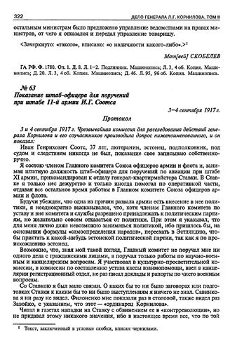 Показание штаб-офицера для поручений при штабе 11-й армии И.Г. Соотса. 3—4 сентября 1917 г. // ГА РФ. Ф. 1780. Оп. 1. Д. 11. Л. 69—71 об. Автограф.