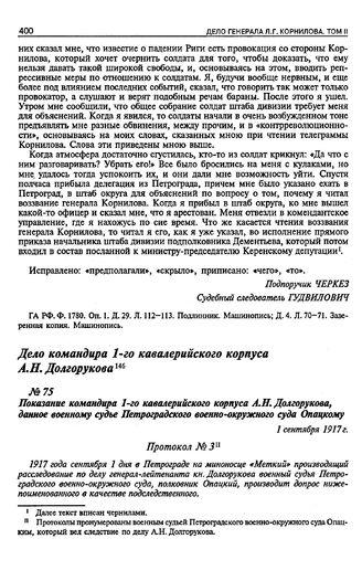 Дело командира 1-го кавалерийского корпуса А.Н. Долгорукова. Показание командира 1-го кавалерийского корпуса А.Н. Долгорукова, данное военному судье Петроградского военно-окружного суда Опацкому. 1 сентября 1917 г. // ГА РФ. Ф. 1780. Оп. 1. Д. 29. Л. 135 об. — 137 об. Автограф.