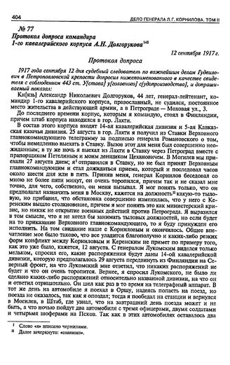 Дело командира 1-го кавалерийского корпуса А.Н. Долгорукова. Протокол допроса командира 1-го кавалерийского корпуса А.Н. Долгорукова. 12 сентября 1917 г. // ГА РФ. Ф. 1780. Оп. 1. Д. 29. Л. 157-158 об. Подлинник. Машинопись; Д. 4. Л. 92-93 об. Заверенная копия.
