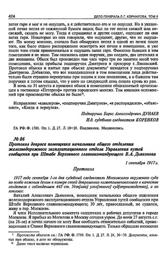 Протокол допроса помощника начальника общего отделения железнодорожного эксплуатационного отдела Управления путей сообщения при Штабе Верховного главнокомандующего В.А. Дьяконова. 1 сентября 1917 г. // ГА РФ. Ф. 1780. Оп. 1. Д. 27. Л. 31, 31 об. Подлинник. Машинопись.