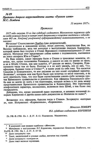 Протокол допроса корреспондента газеты «Русское слово» М.С.Лембича. 31 августа 1917 г. // ГА РФ. Ф. 1780. Оп. 1. Д. 27. Л. 13. Подлинник. Машинопись.