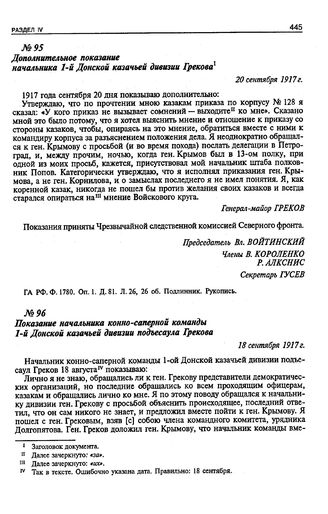 Дело начальника 1-й Донской казачьей дивизии Грекова. Показание начальника конно-саперной команды 1-й Донской казачьей дивизии подъесаула Грекова. 18 сентября 1917 г. // ГА РФ. Ф. 1780. Оп. 1. Д. 81. Л. 17, 17 об. Подлинник. Рукопись.
