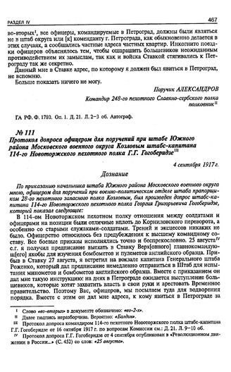 Показания офицеров штабов о командировании их в Ставку для изучения минометов и бомбометов. Протокол допроса офицером для поручений при штабе Южного района Московского военного округа Козловым штабс-капитана 114-го Новоторжского пехотного полка Г.Г. Гогоберидзе. 4 сентября 1917 г. // ГА РФ. Ф. 1780. Оп. 1. Д. 84. Л. 10, 10 об. Подлинник. Машинопись; Д. 21. Л. 7, 7 об. Копия. Машинопись. Частично опубл.: Революционное движение в России в августе 1917 г. Разгром корниловского мятежа. М., 1959. С. 452, 453.