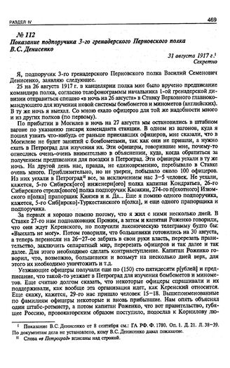 Показания офицеров штабов о командировании их в Ставку для изучения минометов и бомбометов. Показание подпоручика 3-го гренадерского Перновского полка В. С. Денисенко. 31 августа 1917 г. // ГА РФ. Ф. 1780. Оп. 1. Д. 21. Л. 60-62. Автограф.