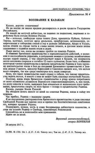Воззвание к казакам. 28 августа 1917 г. // ГА РФ. Ф. 1780. Оп. 1. Д. 27. Л. 40. Типогр. экз.; Там же. Д. 47. Л. 11. Типогр. экз.