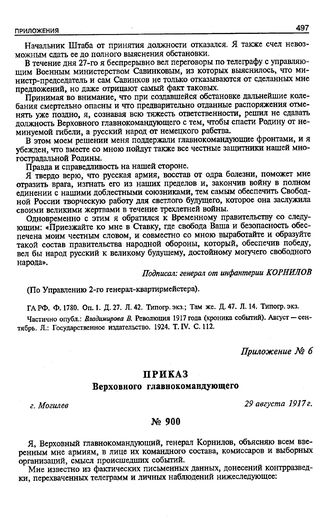 Приказ Верховного главнокомандующего. г. Могилев. 29 августа 1917 г. // ГА РФ. Ф. 1780. Оп. 1. Д. 27. Л. 109. Типогр. экз.; Там же. Д. 47. Л. 19. Типогр. экз.