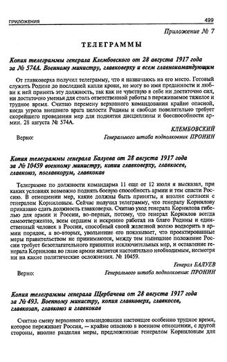 Копия телеграммы генерала Клембовского от 28 августа 1917 года за № 574А. Военному министру, главковерху и всем главнокомандующим // ГА РФ. Ф. 1780. Оп. 1. Д. 27. Л. 49. Типогр. экз.; Там же. Д. 47. Л. 18. Типогр. экз. Опубл.: Корниловские дни. Бюллетени Временного военного комитета. Пг., 1917. С. 117— 119; Революционное движение в России в августе 1917 г. Разгром корниловского мятежа. М., 1959. С. 454-456.