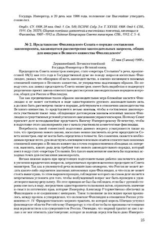 Представление Финляндского Сената о порядке составления законопроекта, касающегося рассмотрения законодательных запросов, общих для империи и Великого княжества Финляндского. 23 мая (5 июня) 1908 г.
