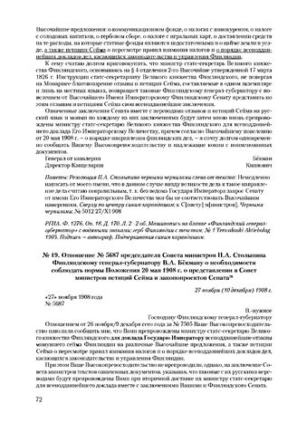 Отношение № 5687 председателя Совета министров П.А. Столыпина Финляндскому генерал-губернатору В.А. Бекману о необходимости соблюдать нормы Положения 20 мая 1908 г. о представлении в Совет министров петиций Сейма и законопроектов Сената. 27 ноября (10 декабря) 1908 г.