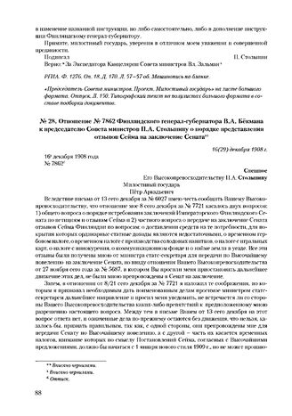 Отношение № 7862 Финляндского генерал-губернатора В.А. Бекмана к председателю Совета министров П.А. Столыпину о порядке представления отзывов Сейма на заключение Сената. 16(29) декабря 1908 г.