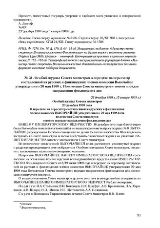 Особый журнал Совета министров о передаче на пересмотр составленной из русских и финляндских членов Комиссии Высочайше утвержденного 20 мая 1908 г. Положения Совета министров о новом порядке направления финляндских дел. 23 декабря 1908 г. (5 января 1909 г.) // РГИА. Ф. 1276. Оп. 18. Д. 66. Л. 496 496 об. Типографский текст. Опубл.: Особые журналы Совета министров Российской империи. 1906 1908 гг. /1908 год. М., 2011. С. 564. (Публ. по: Ф. 1276. Оп. 20. Д. 29. Л. 102-102об.; Ф. 1276. Оп. 18. Д. 54).