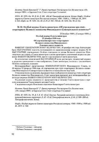 Особый журнал Совета министров «Об учреждении при статс-секретариата Великого княжества Финляндского Совещательного комитета». 23 декабря 1908 г. (5 января 1909 г.)