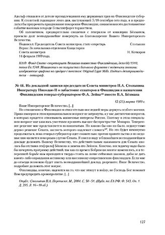 Из докладной записки председателя Совета министров П.А. Столыпина Императору Николаю II о забастовке сенаторов в Финляндии и назначении Финляндским генерал-губернатором Ф.А. Зейна вместо В.А. Бекмана. 12 (25) марта 1909 г.
