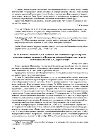 Протокол заседания № 1 Комиссии для составления проекта правил о порядке издания касающихся Финляндии законов общегосударственного значения (Комиссии П.А. Харитонова). 16(29) июня 1909 г. // РГИА. Ф. 1276. Оп, 18. Д. 608. Л. 172-181. Черновой вариант. Машинопись. Л. 166-171. Чистовой вариант. Типографский текст. РНБ. Шифр: 135/300-80. Государственный совет. Материалы. Т. 80 [3]. С. 5-10; Шифр: 30-31/5-32. Совет министров. [Законопроекты, внесенные Советом министров...] [8]. Материалы по вопросу о порядке издания касающихся Финляндии законов общегосударственного значения. Л. 206-208 об. Типографский экз. Опубл.: Финляндская газета. 1909, 21 июня (4 июля). № 94. С. 1-2; Материалы по вопросу о порядке издания касающихся Финляндии законов общегосударственного значения. СПб., 1910. С. 123-128.
