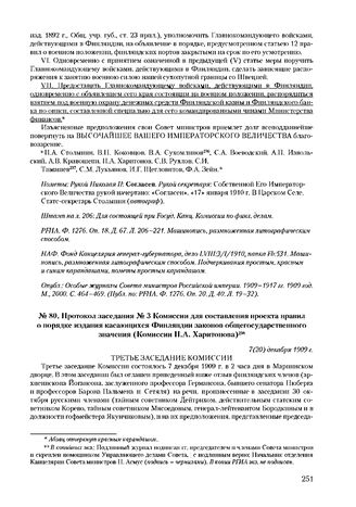 Протокол заседания № 3 Комиссии для составления проекта правил о порядке издания касающихся Финляндии законов общегосударственного значения (Комиссии П.А. Харитонова). 7(20) декабря 1909 г.
