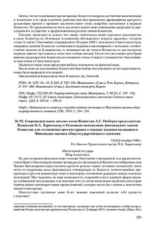 Сопроводительное письмо члена Комиссии А.Г. Нюберга председателю Комиссии П.А. Харитонову к Основным положениям финляндских членов Комиссии для составления проекта правил о порядке издания касающихся Финляндии законов общегосударственного значения. 13(26) декабря 1909 г.