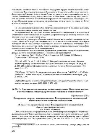 Из проекта закона о порядке издания касающихся Финляндии законов и постановлений общегосударственного значения с объяснениями. 14(27) января 1910 г. // РНБ. Шифр: 135/300-80. Государственный совет. Материалы. Т. 80 [6]. С. 116-120. Типографский текст.