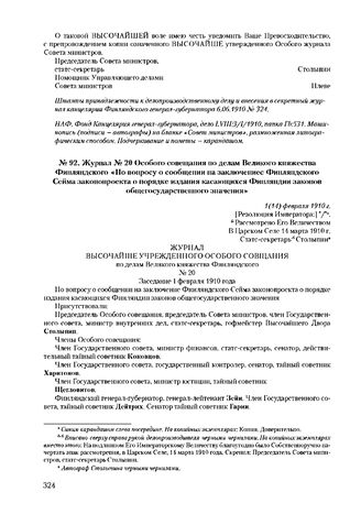 Журнал № 20 Особого совещания по делам Великого княжества Финляндского «По вопросу о сообщении на заключение Финляндского Сейма законопроекта о порядке издания касающихся Финляндии законов общегосударственного значения». 1(14) февраля 1910 г.