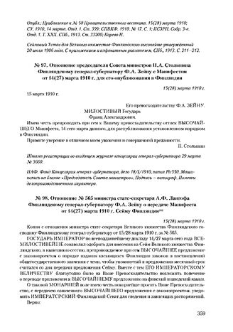 Отношение председателя Совета министров П.А. Столыпина Финляндскому генерал-губернатору Ф.А. Зейну с Манифестом от 14(27) марта 1910 г. для его опубликования в Финляндии. 15(28) марта 1910 г.